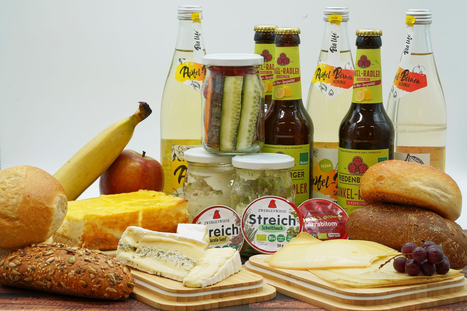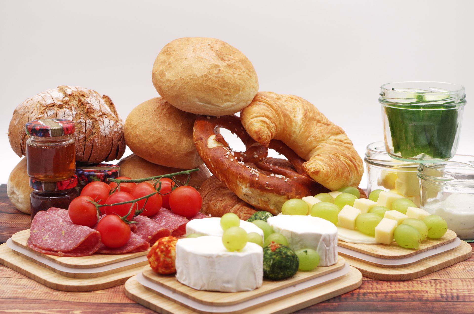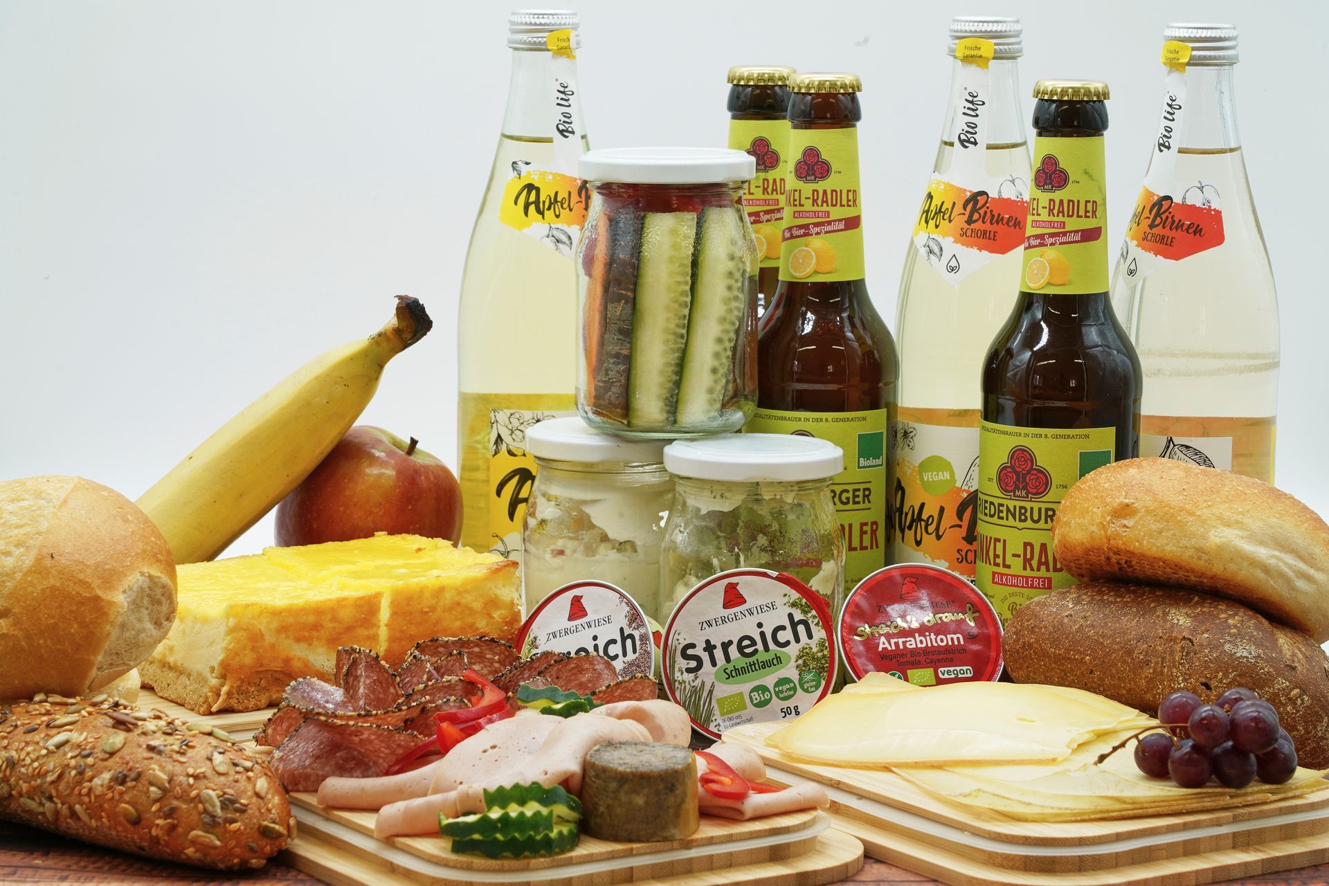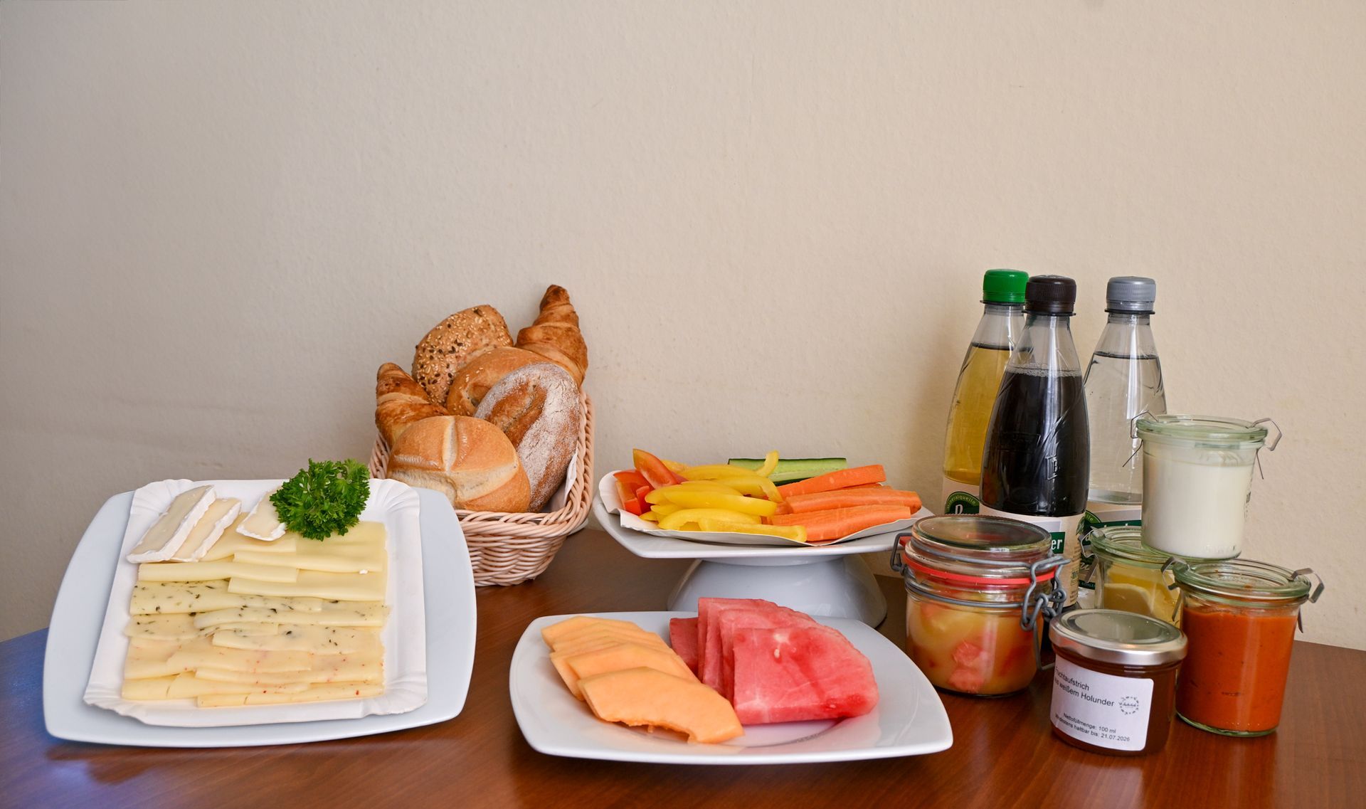 mit Käseaufschnitt, Weichkäse, Brotaufstriche, Rohkost und Dip, Obst, Brötchen und Getränke