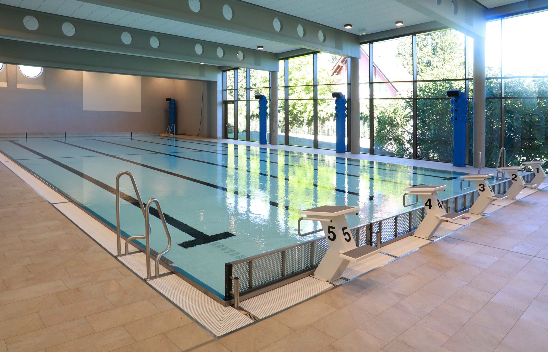Die neue Schwimmhalle im Schulzentrum Erbendorf besitzt ein Schwimmbecken (25 x 12,5 m) und fünf markierten Bahnen samt Startblöcken für Wettkämpfe.